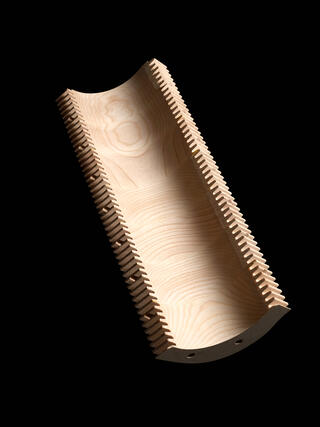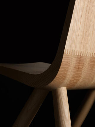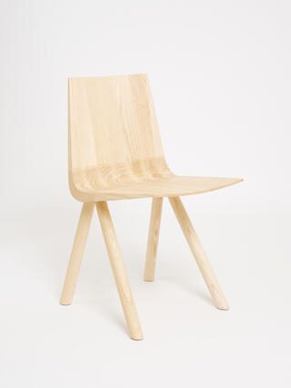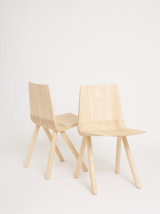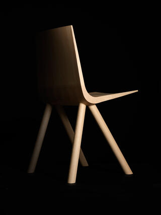 Cresta is oriented towards the chair type of a ‚Stabelle‘, a traditional rural chair with legs and backrest dovetailed into a solid seat. The iconic chair from the Alps served both as a model and as inspiration: as a model in the choice and simplicity of methods; as inspiration with regards to its expression and ornaments. Cresta plays with the basics of a chair. The back, the seat, and the four legs are joined with a milled, round central piece. The energetic centre of the chair joins the seat and the backrest using the industrial technique of interlocking joints. The construction is intentionally exposed and becomes an ornament. Like a ‘Stabelle’, the four legs are inserted and glued into drill holes in the central element. The name of the chair uses an Italian expression to indicate the core of the design.