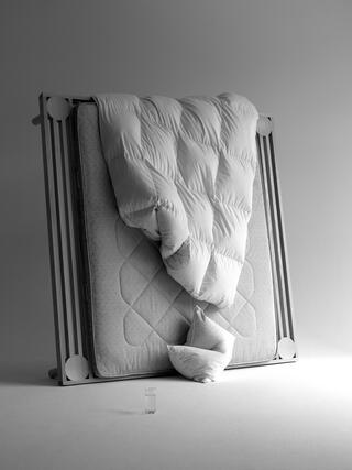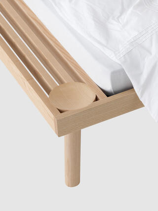 Four legs carry a frame of massive ash wood, which encloses the contents of the bed. The frame forms both a boundary and shelf. The four legs are the central features in this design. They have the most important task of the bed as they carry the person lying in it. Where the legs are joined with the frame, they each form a bowl that provides a night-time home for various smaller objects. Watch, jewellery, indispensable items for sleep, night and love.