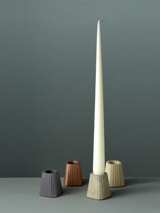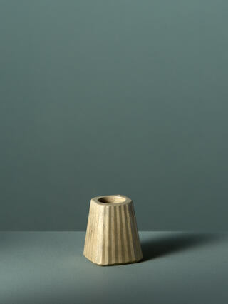 Heinz Unger A candlestick is a special object. From a functional point of view, it consists of a hole and sufficient weight. These are the conditions. This circumstance leaves a lot of room for design. In this case, the conditions guide the design. Like an old weight, known from scales as a counterweight, the solid leads conically towards the hole lying on the upper side. The light refracts in the facets and shows the materialization from different angles.