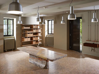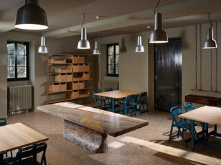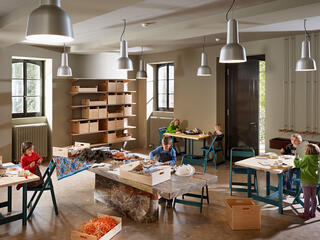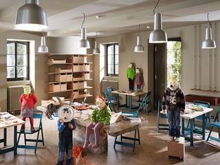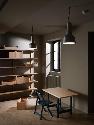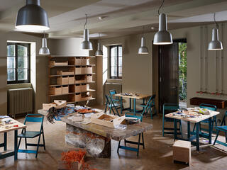 The project is located in the coach house of the Museum Rietberg in Zurich. The simple building flanks the magnificent Villa Wesendonck, built by the Swiss architect Leonhad Zeugheer in 1853-57. Since 1952 the neoclassical building has been the seat of the Museum Rietberg, which specialises in non-European art. The brief was for a new space that could be transformed in just a few moves from an inspirational studio space for art education with children into a solemn space for celebrations and events. The point of departure for this project was the typology of the artist’s studio. Five product designs were produced specifically for this space: folding chair, wooden table, stone table, hanging lamp, and shelves. As in a studio, the atmosphere is created by a mixture of pragmatic planning and uniquely individual pieces.