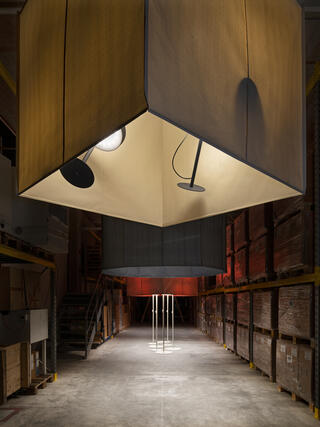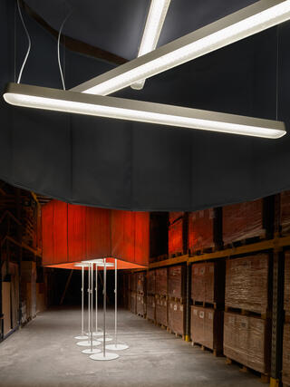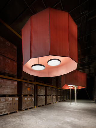 Ingmar Kurth An oversized garland lends a unique character to the space between the almost ceiling-high storage racks of the company Glas Trösch. The narrow, high and dark aisles invite such a solution. Visitors progress through the aisles under and next to the 3D-shapes. The five paper lamps in the colours of the Schätti lamp collection are suspended from the ceiling. The translucent shapes are illuminated by the lamps of the collection.
