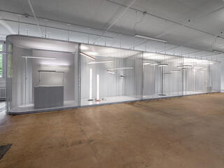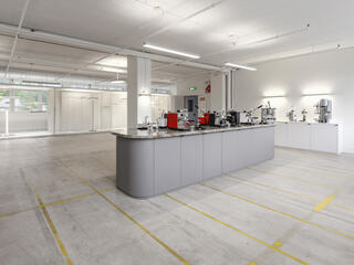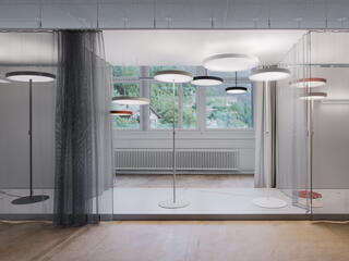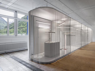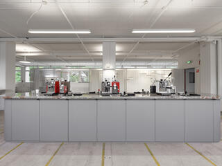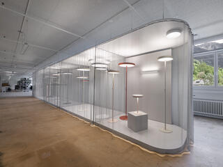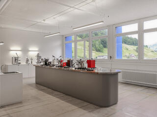 Felix Wey The luminaires‘ presentation in the workshop of Schätti Leuchten, is deliberately not a spatially separated showroom. The only devision between workshop and presentation area is a semi-transparent curtain, which shields the daylight and allows the luminaires to work in the atmosphere of their place of origin. At the same time the coffee bar with Arzo stone from Ticino (Switzerland), which was used for many bar counters in Milan, is also located in the middle of the workshop and provides a presentation area for the Olympia coffee machines.