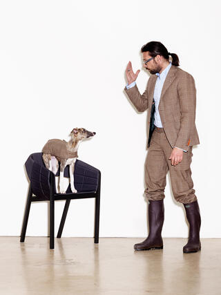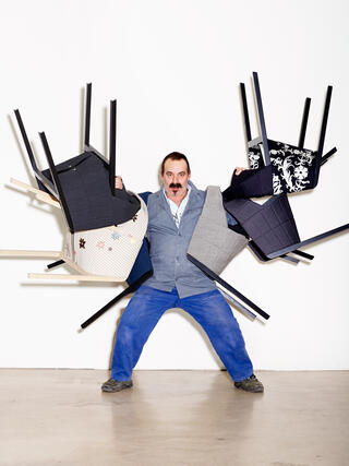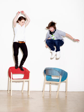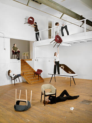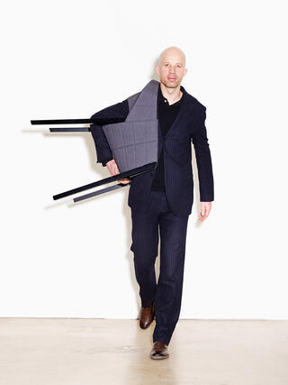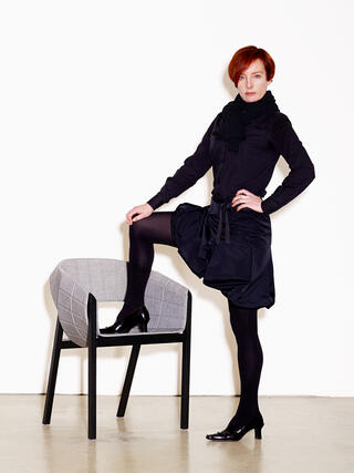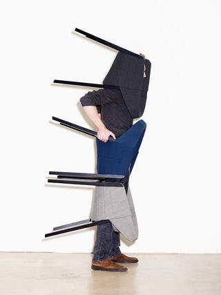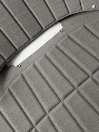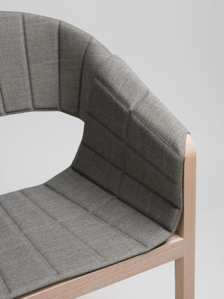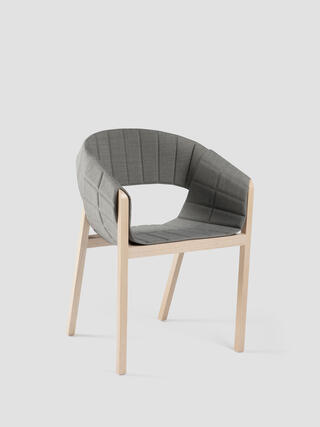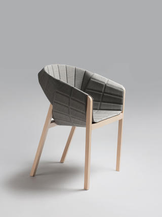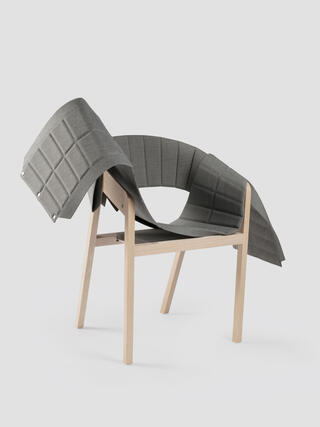 The challenge to design a new upholstered chair for the Swiss company Wogg resulted in a new type of chair, which was presented for the first time in 2007 at the furniture fair in Milan. It took a total of four years of development time before it was ready for serial production in 2009. Two pads are wrapped around a delicate wooden frame of solid ash wood and fixed in place with press studs. It is a simple method to fold and fix in place the two-dimensional quilted pads. Forming a seat shell with a collar wrapped around the backrest, these pads are the actual innovation. The fabric parts, made from pure wool and pressed between two aluminium shells, can be produced as two-dimensional pieces. Precisely measured and welded in a high frequency procedure, it only takes a few seconds for them to leave the press. Wogg 42 is designed as an industrial product through and through. The Wogg collection ceased production of this chair in 2021.