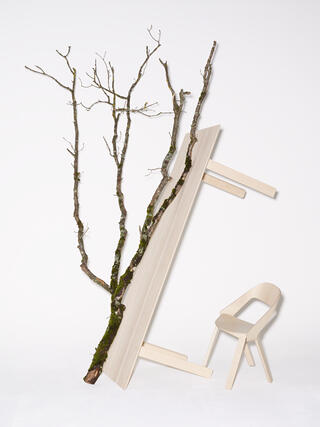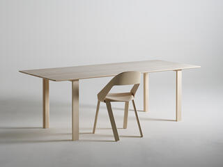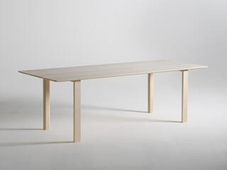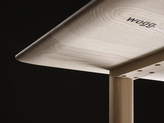 Milo Keller The table is the complement to the plywood chair Wogg 50. The idea for this table is derived from the tradition of carpentry. Any large solid wood board needs to be stabilised. The solution for this problem is the batten. It has been used for centuries whenever a large wooden board needs to be kept in shape. The two leg braces take on this function and stabilise the table top. The sculptural qualities of this table manifest primarily in the details.